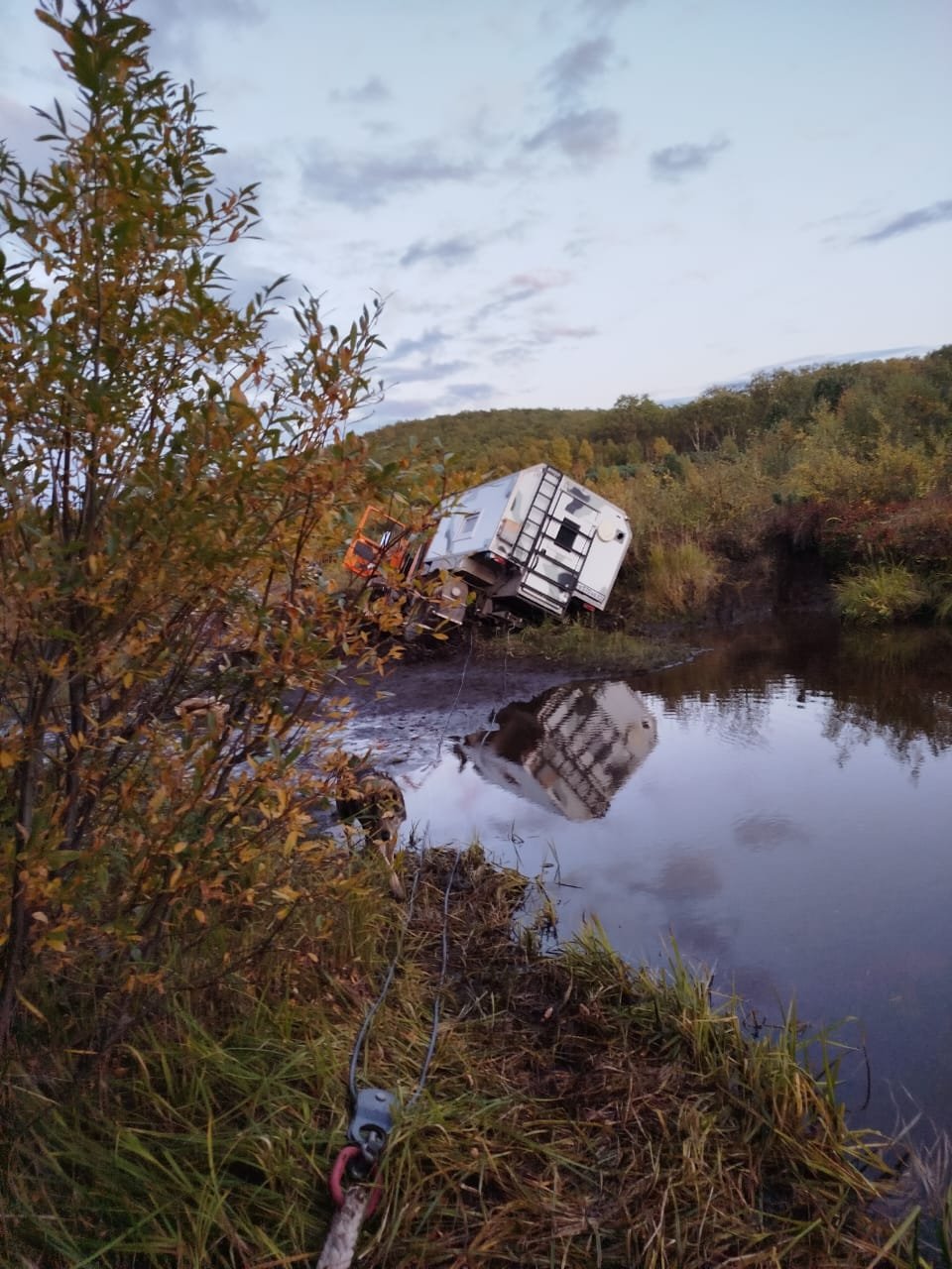 ,дым с матора пошол...зил заякоренный за деревья,вытащил через блок ,морда у зила на метр сместилась вбок,(небыло видно в кустах-траве ровно ли ложились троса к деревьям,проложили примеерно ровно)при лебежении .сутки парни сидели,спали на боку
