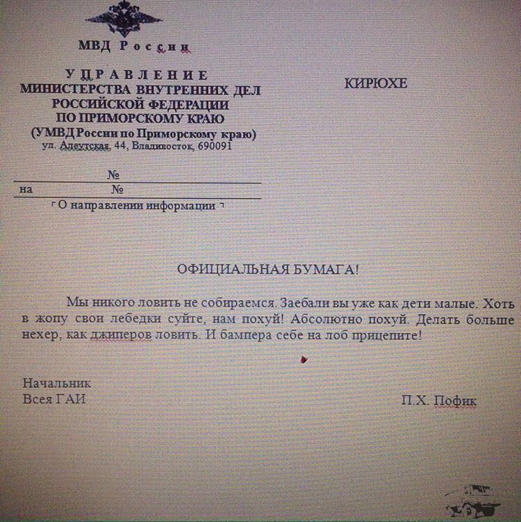 Lord Set писал(а):[post]326600[/post]Sakhalinec писал(а):[post]326553[/post] Говорили наши пацанчики жиперы и рейсеры с простыми ментами,и дружок есть на дороге стоит -говорят это спуск команды из маскфы.У нас дрюкали в ту субботу и вскр. Понед камчадалы взяли за попу своего губера тот на презика,короче с вторника вся движуха тормознулась.У нас жиперы и гонщики уже тачки приготовили на забастовку( бросать их просто посреди города).На Дальнем Востоке нам ещё хуже - ближайшая сертифицированная контора на переделки вроде в красноярске.