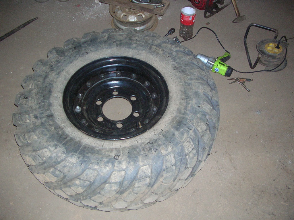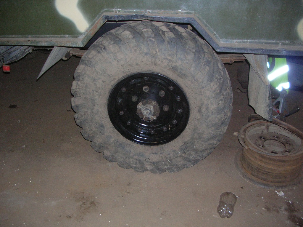 Пару дней назад привезли из армии колеса с болтовыми дисками, давно хотел поменять свои ржавые диски с кольцом на болтовые и сделать небольшой вынос путем переворачивания середины диска и также шпильки диска в таком положении не будут мешать суппортам. Пришлось в срочном порядке переобувать колеса, тк диски отдавали взамен моих - в армии оставшиеся 66-тые не должны стоять на пеньках.